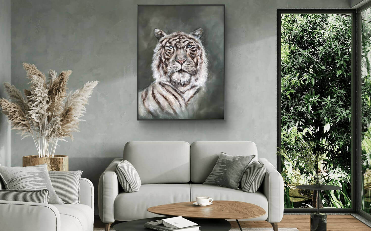 Nimm 2–3 Töne aus dem Kunstwerk (z. B. Sand + Dunkelbraun + gedämpftes Blau) und wiederhole sie in Kissen, Teppich oder Vasen. Ergebnis: wirkt automatisch durchdacht.